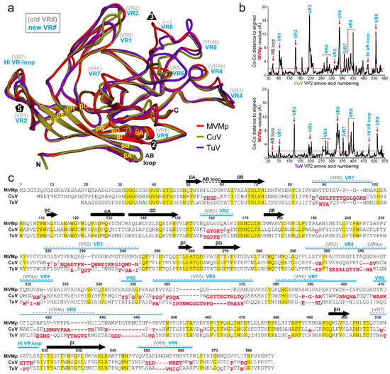 To annotate observed capsid surface differences among the protoparvoviruses (Figure 2), and potentially functional regions, the VP models of CuV and TuV were superposed onto that of MVMp (PDB-ID: 1Z14), whose capsid was functionally annotated previously [21,43,44]. This superposition resulted in an overall RMSD of 3.0 Å for CuV vs. MVMp, 2.2 Å for TuV vs. MVMp, and 2.7 Å for CuV vs. TuV (Table 2). These numbers are substantially higher than for previously reported protoparvovirus VP structure comparisons, with maximum RMSDs of ~1.0 Å [37,39]. Despite the higher RMSD values, CuV and TuV conserve the core β-strands (βA–βI) and α-helix A (αA) which are superposable to MVMp (Figure 3a). As such, the core of the VP structure (without VRs) shows comparative low RMSD values between 0.8 and 1.0 Å (Table 2). High structural variability was observed in the surface loops (Table 2, Figure 3a and b). In some VP regions, the Cα-Cα distance between aligned structures exceeded 17 Å in the case of CuV vs. MVMp, and up to 11 Å for TuV vs. MVMp (Figure 3b). While most of the observed structural differences were located within previously defined VRs [39], some of the structural variability was detected outside of these previously defined regions, such as in the AB-loop, between VR6 and VR4b, and between VR4b and βH (Figure 3c, gray VR numbering).