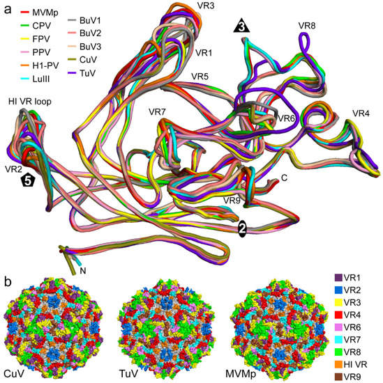 Structural comparison of protoparvoviruses. (a) The superposed VP structures for all available members are shown as coil diagrams: MVMp (red), CPV (green), FPV (yellow), PPV (pink), H1-PV (orange), LuIII (cyan), BuV1 (gray), BuV2 (salmon), BuV3 (tan), CuV (olive), and TuV (purpleblue). The N- and C-terminus, the approximate icosahedral 2-, 3-, and 5-fold axis, and the VRs are indicated. (b) Surface representations of the CuV, TuV, and MVMp capsids. The new VR assignment is used and colored as indicated in the legend on the right. This figure was generated using PyMol [45].