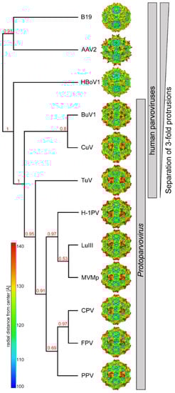 Cladogram showing the capsid amino acid and structural relationship between the protoparvoviruses and selected members of human parvoviruses. B19: parvovirus B19; AAV: adeno-associated virus; HBoV: human bocavirus. This image was generated online (http://www.phylogeny.fr/) utilizing the VP2/3 sequences as input. Branch support values are given. Radially-colored capsid surface representations (blue to red, as shown in the scale bar on the left) are viewed along the 2-fold axis and generated using Chimera [27].