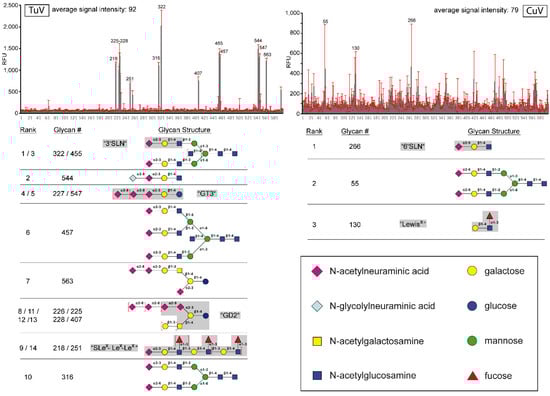 Glycan array of CuV and TuV. Relative fluorescence units (RFU) versus glycan number for TuV (top left) and CuV (top right) VLPs. 600 different glycan molecules (CFG glycan array v5.2) were screened. The gray bars represent the fluorescence detected for each glycan with the standard deviation shown in red. Below each histogram are symbol representation of the glycans with the highest signals. Trivial names of glycans are given where available. The definition of each symbol is provided on the bottom right hand side.