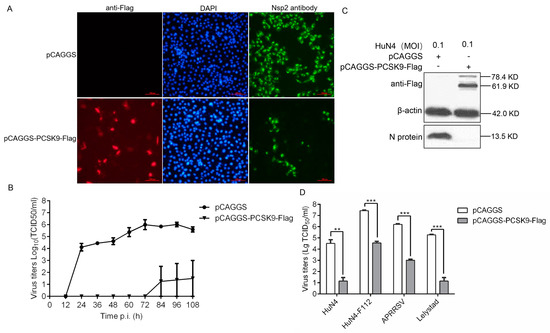 In our previous study, we performed a liquid chromatography-tandem mass spectrometry (LS-MS/MS) analysis of PAMs infected with or without the PRRSV strain HuN4-eGFP. The LS-MS/MS result showed that the PCSK9 expression level increased significantly upon PRRSV strain HuN4-eGFP infection in PAMs compared to in the mock infected PAMs [47]. However, the function of PCSK9 in PRRSV replication is not yet defined. To this end, we overexpressed PCSK9 in MARC-145 cells by transfecting a vector expressing porcine PCSK9 to evaluate the effect of PCSK9 on PRRSV replication. Firstly, the PCSK9-transfected MARC-145 cells were infected with the highly pathogenic PRRSV strain HuN4, and then, the expression of the PRRSV nsp2 protein was analyzed by immunofluorescence. As shown in Figure 1A, the fluorescence signal was significantly lower in pCAGGS-PCSK9-Flag-transfected cells compared to that in the empty vector pCAGGS-transfected cells. In addition, we collected virus-containing supernatant after HuN4 strain infection from pCAGGS-PCSK9-Flag- and pCAGGS-transfected MARC-145 cells at different time points. Compared to those in control, the virus titers from the PSCK9-overexpressing cells were much lower (Figure 1B). We further confirmed this finding by investigating the expression level of the PCSK9 protein and PRRSV N protein using Western blotting (WB) (Figure 1C). Taken together, these data indicated that PCSK9 inhibited PRRSV replication in vitro.