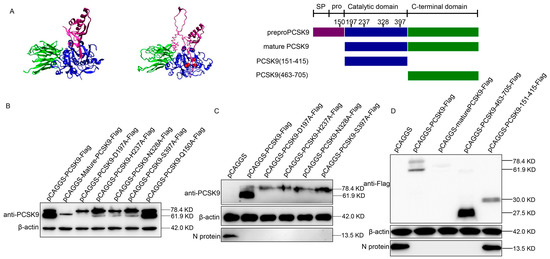 The C-terminal domain of PCSK9 has antiviral activity. (A) Left: 3D structure of human PCSK9 protein; middle: predicted 3D structure of porcine PCSK9 protein using program I-TASSER; red sphere: residues D197, H237, N328, and S397; purple: SP (signal peptide) and prodomain; blue: catalytic domain; green: C-terminal domain; right: domain organization and engineering of single residue mutant and truncation constructs of PCSK9. (B) MARC-145 cells were transfected with either mutated PCSK9 (D197A, H237A, N328A, S397A, and Q150A) or the empty vector pCAGGS. At 36 hpt, the expression of PCSK9 was analyzed by WB. (C) MARC-145 cells were transfected with either mutated PCSK9 or empty vector pCAGGS. At 36 hpt, the cells were infected with HuN4 PRRSV (MOI = 0.1). At 36 hpi, cell lysates were analyzed by WB. (D) MARC-145 cells were transfected with PCSK9-Flag, mature-PCSK9-Flag, PCSK9-151-415-Flag, and PCSK9-463-705-Flag, respectively. The cells were then infected with HuN4 PRRSV (MOI = 0.1), and the cell lysates were analyzed by WB at 36 hpi.