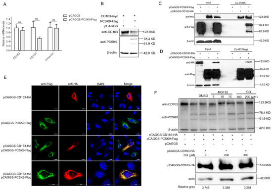 The function of PCSK9 is the binding of specific cell surface receptors to bring them towards the intracellular lysosome degradation compartments [49,50]. In addition to reducing the receptors through the lysosome, PCSK9 also can directly interact with CD36 and target the receptor to lysosomes through a mechanism involving the proteasome [51]. These findings suggest that PCSK9 may inhibit PRRSV replication through regulating the virus receptor presenting on target cells through the lysosomal and/or proteasomal pathway. We tested the mRNA abundance of several receptors—CD163, CD151, and vimentin—upon PCSK9 overexpression in MARC-145 cells. As expected, none of these receptors showed a significant difference in terms of mRNA amounts after PCSK9 overexpression (Figure 3A), suggesting that PCSK9 could regulate CD163 post translation. Therefore, HEK-293T cells were transfected with pCAGGS-CD163-HA and pCAGGS-PCSK9-Flag or pCAGGS vector. The cell lysates were analyzed by WB. Compared to control, the level of CD163 significantly decreased in PCSK9-overexpressing cells (Figure 3B). To further examine whether the PCSK9 protein could bind to CD163, HEK-293T cells were co-transfected with pCAGGS-CD163-HA and/or pCAGGS-PCSK9-Flag. The cells were lysed for immunoprecipitation with an antibody against HA tag, followed by WB analysis with antibodies against Flag and HA tag. As shown in Figure 3C, the level of PCSK9 protein in the presence of CD163 was significantly higher than that of the empty vector, whereas there were similar levels of the PCSK9 protein in the input with or without CD163 protein. We further confirmed the interaction between PCSK9 and CD163 by immunoprecipitating with an antibody against Flag tag followed by WB analysis with antibodies against Flag and HA tag (Figure 3D). Furthermore, colocalization studies were conducted by co-transfecting HeLa cells with pCAGGS-CD163-HA and/or pCAGGS-PCSK9-Flag. Immunofluorescence analysis showed that PCSK9 and CD163 colocalized both in the cytoplasm and on the cell membrane (Figure 3E).