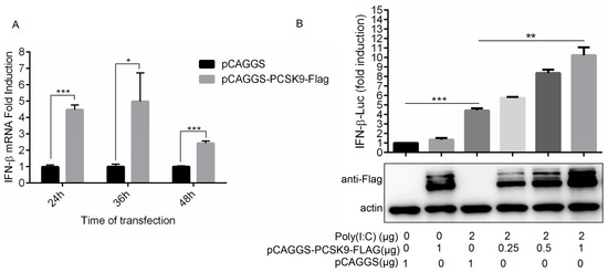 PCSK9 promotes interferon production in a dose-dependent manner. (A) MARC-145 cells were transfected with either pCAGGS-PCSK9-flag or the empty vector pCAGGS. At different time points as indicated after transfection, the cells were harvested and total RNAs were purified. The expression of IFN-β was assessed by RT-qPCR with specific primers for IFN-β. Error bar: mean ± SEM; *, p ≤ 0.05; ***, p ≤ 0.001. (B) HEK-293T cells were transfected with different amounts of pCAGGS-PCSK9-flag or the empty vector pCAGGS then treated with or without Poly (I:C). The activity of luciferase was monitored to evaluate the activity of the IFN-β promoter.
