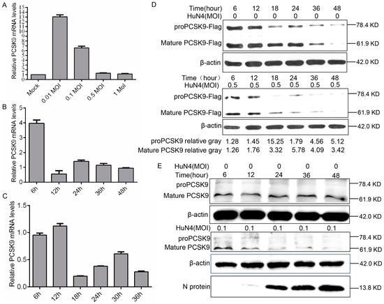 To examine the possible influences of PRRSV on PCSK9 expression, we infected MARC-145 cells with different doses of the PRRSV strain HuN4. The RT-qPCR results showed that endogenous PCSK9 mRNA expression increased significantly compared to that in the mock control when the cells were infected with a low dose of the virus (Figure 5A). Interestingly, the PCSK9 expression level is comparable to that in the mock control when they are infected with a high dose of the virus (Figure 5A). To further examine the PCSK9 expression changes during PRRSV infection, we infected MARC-145 cells with HuN4 and quantified PCSK9 expression using RT-qPCR. The PCSK9 expression level decreased as the time increased after infection (Figure 5B). We confirmed this finding with PAM cells; as shown in Figure 5C, PRRSV reduces the PCSK9 expression level in a time-dependent manner. We further examined the PCSK9 protein level at various time points in MARC-145 cells that were transfected with PCSK9 followed by HuN4 virus infection. The WB result showed that the PCSK9 protein level decreased as the infection time increased compared to that in the mock infection control (Figure 5D). A similar result was observed in PAMs; endogenous PCSK9 expression decreased as the infection time increased, whereas that of the PRRSV N protein did the opposite (Figure 5E).
