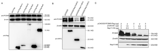PRRSV nsp11 could inhibit PCSK9 expression. (A and B) PRRSV non-structural protein sequences including nsp1α, nsp1β, nsp2, nsp4, nsp9, nsp10, nsp11, and nsp12 were cloned into p3X-Flag or pCAGGS vectors with Flag or MYC tag. HEK-293T cells were cotransfected with pCAGGS-PCSK9-Flag (2 μg) and different nsp constructs (2 μg). At 36 hpt, cell lysates were collected and analyzed by WB for PCSK9 expression and nsp expression. (C) PCSK9 expression construct pCAGGS-PCSK9-Flag was cotransfected with different doses of an expression vector encoding nsp11. At 36 hpt, cell lysates were collected and analyzed by Western blotting.