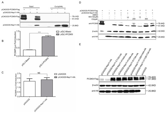 In light of the significant consequences of the nsp11-mediated negative regulation of PCSK9 expression, we further explored the molecular mechanism. Firstly, to examine whether there was an interaction between the nsp11 and PCSK9 proteins, cells were co-expressed with pCAGGS-HA-Nsp11 and pCAGGS-PCSK9-Flag. Co-IP was performed with an antibody against HA, followed by WB analysis. As shown in Figure 7A, nsp11 did not interact with the PCSK9 protein. Secondly, to figure out the binding of nsp11 to the promoter regions of PCSK9 to inhibit PCSK9 transcription, we measured PCSK9 promoter activity in nsp11-over-expressing cells. For this purpose, HEK-239T cells were cotransfected with a luciferase reporter containing the PCSK9 promoter with or without pCAGGS-HA-Nsp11. The reporter luciferase activity showed no significant difference between the nsp11-over-expressing cells and the control group (Figure 7B,C), indicating that nsp11 could not regulate PCSK9 transcription by binding to the PCSK9 promoter. Then, we investigated if nsp11 targeted PCSK9 through the proteasome pathway or lysosome pathway. Through the inhibition of the proteasome or lysosome, we confirmed that neither the proteasome nor lysosome was responsible for the down-regulation of PCSK9 (Figure 7D). Finally, we constructed a set of nsp11 constructs containing mutations that could inactivate either the endoribonuclease activity or deubiquitinating activity of nsp11 and cotransfected pCAGGS-PCSK9-Flag with nsp11 mutants into cells. The WB results showed that nsp11 mutants with inactivated endoribonuclease activity lost the function of antagonizing PCSK9 antiviral activity, whereas those nsp11 mutants that lost their deubiquitinating activity did not (Figure 7E). Collectively, these results showed that nsp11 negatively regulated PCSK9 expression through its endoribonuclease activity, not deubiquitinating activity.