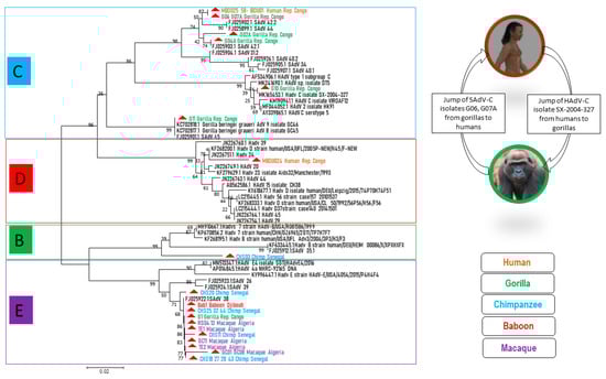 As demonstrated in Figure 2, HAdV-E members seemed to be well adapted in NHPs, since they were present in all NHPs in this study, except green monkeys (perhaps because of the small number of samples), and they clustered both with one another and with SAdV-E members. Although AdVs are generally considered to be rather host species-specific viruses, there are some exceptions []. Indeed, HAdV-E could be an exception, since African great apes, as well as macaques or other monkeys in our study, carried HAdV-E members. For HAdV-E type occurrence in this study, wild Senegalese chimpanzees were the most numerous hosts (50% of cases), followed by macaques (39%) and then gorillas and baboons (5.5% of cases for each). Herein, the hypothesis that NHP AdV members of the HAdV-E originated from chimpanzees [,], and because chimpanzees, gorillas and baboons all live in sub-Saharan Africa, we can suppose that the gorilla and baboon HAdV-E types of this study were the result of chimpanzee AdV transmission. The evolution of HAdV-E viruses and their adaptation to new hosts requires further investigation.