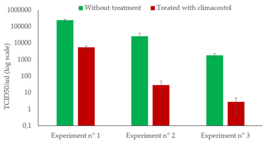For each experiment, the reduction effect on HAdV5 replication was evaluated by comparing the viral titers of the negative control and the suspension treated with climacostol (Figure 3). Under the experimental conditions, our results showed that climacostol was able to reduce HAdV5 infectivity. We observed a 1.62 Log10 (97.6%) infectivity decrease when the initial titer of the suspension was 2.36 × 105 TCID50/mL, and around a 3 Log10 (99.9%) reduction, namely a 2.90 Log10 and 2.80 Log10 abatement, when the starting HAdV5 titer was 2.58 × 104 and 1.82 × 103 TCID50/mL, respectively (Table 1).
