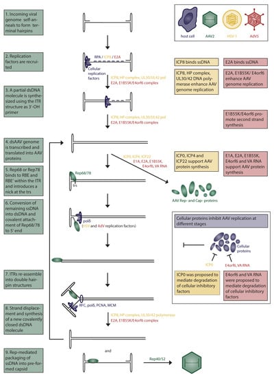Boxed texts on the left (green) describe each step during AAV replication. The role of HSV-1 (yellow) or AdV5 (red) helper factors and interfering cellular factors (purple) are indicated in the figure and described on the right. AAV Rep-proteins are depicted in green. HSV-1 and AdV5 helper factors in Step 6 are unclear and, therefore, put in brackets.