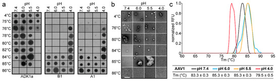 Monitoring the stability of the AAV capsid in response to acidity changes was aimed at understanding how the low pH within endosomes and lysosomes prime the AAV capsid for VP1u externalization and genome uncoating. The pH-dependent thermostability of AAV1-GFP vectors assessed by native dot immunoblots showed that the capsids remained intact for up to 84 °C at pH 7.4. Negative-stain EM (EM) images confirmed this observation with intact capsids seen at 84 °C but not at 85 °C (Figure 1a,b). However, the observation of B1 and A1 signals at 84 °C suggests that some of the capsids were either already partially denatured at this temperature, consistent with the fewer intact capsids observed by EM at 84 °C compared to lower temperatures, or capsids are sufficiently “opened up” to expose the N- and C-terminus. As the pH decreased to 6.0 and 5.5, the stability of the capsids increased, with intact capsids detected at 85 °C (Figure 1a,b). At pH 4.0, the AAV1 capsids were destabilized, reducing the temperature at which the ADK1a signal was detected to 76 °C (Figure 1a). However, no capsids were observed by EM at 76 °C (although virus aggregates were present at 75 °C; data not shown), suggesting that the virus is no longer intact at this temperature (Figure 1b). The Tm determined for AAV1 at the different pHs by DSF (Figure 1c) largely confirmed the data from the native dot immunoblot and EM data (Figure 1a,b) and indicated that the capsids should be intact up to 83.3, 85.3, 85.3, and 79.5 °C at pH 7.4, 6.0, 5.5, and 4.0, respectively (Figure 1). A minor discrepancy was observed at pH 4.0, with the Tm~3–4 °C higher by DSF compared to the native dot immunoblot and EM data. However, the overall trend in stability in response to pH was the same, with the highest stability occurring at pH 5.5 and the lowest at pH 4.0. In addition, the dot immunoblots showed no A1 or B1 signals under the acidic conditions at 4 or 75 °C; only heat resulted in detection at temperatures close to the Tm under these conditions (Figure 1a).