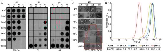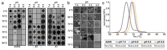 At pH 7.4, the observed thermostability for AAV8 using dot immunoblots, EMs, and DSF indicated that the AAV8 capsids were intact to 70.5–72 °C (Figure 4). The capsids were stable to 74–75 °C at pH 6.0 and 5.5 (Figure 4). Dot immunoblot and EM studies at pH 4.0 showed that the capsids were intact to ~70 °C (Figure 4a,b); however, DSF indicated stability to 74.3 °C (Figure 4c). This discrepancy of a higher Tm at pH4.0, determined by DSF, is also seen for AAV1 and AAV2 (Figure 1 and Figure 2). Unlike AAV1, AAV2, and AAV5, the B1 signal was detected at 4 °C at pH 4.0, suggesting that there are either partially broken capsids in the sample or that rearrangements occurring at a low pH [6] expose this epitope (Figure 4a). However, the A1 epitope was detected at lower temperatures at pH 6.0 and 5.5, suggesting that the VP1u was surface-exposed before the capsids denatured, unlike the observation for the other serotypes.
