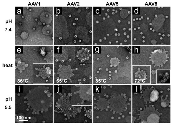 rAAV1-GFP, rAAV5-GFP, and rAAV8-GFP or AAV2-VLP samples were diluted to 2 × 1011 gp/mL or 20 ng/mL, respectively, in citrate-phosphate with 150 mM NaCl at pH 7.4, 6.0, 5.5, or 4.0. The samples were heated for 5 min and cooled to 4 °C. After cooling, the samples were adhered to EM grids and stained as described above.