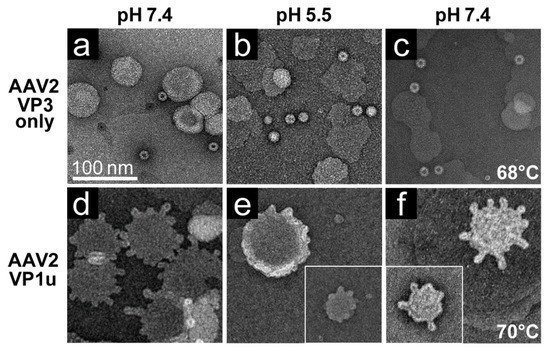 To verify that the VP1u region was responsible for the observed liposome modification at pH 5.5 and after heat-treatment, AAV2 capsids comprised of only VP3 were tested for activity against liposomes. No modification was observed under neutral conditions, acidic pH conditions, or after heat-treatment (Figure 7a–c). In contrast, purified AAV2 VP1u polyprotein incubated with POPC liposomes under neutral conditions, at pH 5.5, or after heat-treatment at 70 °C, resulted in liposome modification under all three conditions (Figure 7d–f). However, as previously reported, the effect was reduced at pH 5.5 compared to pH 7.4. These findings show that the VP1u is the region of the capsids involved in inducing the lipid remodeling observed, and not the VP3 common region. The AAV2 VP1u data also show that the PLA2 remains active after heat-treatment and validates the previous use of heat as a surrogate for externalizing the VP1u from capsids for PLA2 assays.