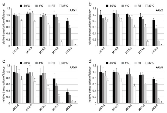 Effect of pH and temperature on AAV transduction. Transduction efficiency of (a) rAAV1, (b) rAAV2, (c) rAAV5, and (d) rAAV8 (all packaging the luciferase gene) in HEK293 cells infected with virus incubated for 24 h in citrate-phosphate buffer at the indicated pH and storage temperature. The transduction efficiency for each AAV serotype is shown relative to virus stored at pH 7.4 and −80 °C. The experiments were performed in triplicate and are displayed as mean+SD (n = 3). #: luciferase read-out similar to uninfected control cells (data not shown) which indicates no transduction.