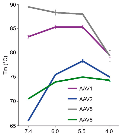 The comparative analysis of AAV1, AAV2, AAV5, and AAV8 confirmed differences in their thermostability, with AAV5 being 20 °C more stable than AAV2 (Figure 9), as previously reported [34,35]. Despite the large range of Tm values for the four serotypes at physiological pH, with the exception of AAV5, acidification reminiscent of the early and late endosomes increased stability, while lysosomal pH conditions decreased the stability below that at pH 7.4 for AAV1 (Figure 9). For AAV2 and AAV8, stability was lowest at pH 7.4. The commonality in stability trend as pH drops suggests that the dynamics associated with trafficking through the endosome is the same for AAV1, AAV2, and AAV8, and suggests a conserved mechanism for VP1u externalization and/or readiness for uncoating. AAV5 is the only serotype analyzed to date which showed a continuous decrease in stability with acidification (Figure 9). This observation was recapitulated with differential scanning calorimetry (DSC, data not shown). AAV5 is also the most thermally stable serotype [35] tested to date. AAV5 has been shown to utilize multiple cellular entry pathways. Thus, its enhanced stability and difference in pH stability profile may be important for trafficking through an alternative pathway. Changing pH alters the protonation state of amino acids, which could alter the interactions between residues or induce conformational changes. Such changes could confer altered stability. For AAV8, structures determined under endo/lysosomal conditions provided information on side-chain conformational changes within and between monomers associated with altered protonation states, including histidines [6]. These changes in interacting residues could influence thermostability.