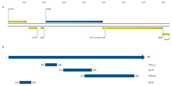 ASFV ORF C962R is located on the positive strand of the ASFV Georgia2007 field isolate (ASFV-G) genome between positions 89,075 and 91,963; the C-terminus of the protein overlaps with the C-terminus of protein ACD_01020, predicted to be transcribed on the negative strand of the ASFV genome. InterPro sequence analysis [25] revealed that C962R contains two Pfam domains: one between amino acids 303–382 (PriCT_2), an alpha-helical domain found at the C-terminal of Primases, and a second domain between amino acids 419–600 (D5-N) found in D5 proteins of DNA viruses and bacteriophage P4 DNA Primase. C962R also contains a PROSITE helicase domain (SF3_Helicase_1) spanning amino acids 607–775; this region is further predicted by PANTHER prediction (PTHR35372) to be a P-loop containing nucleoside triphosphate hydrolase between residues 521–869. Furthermore C962R was not detected in the proteome of ASFV viral particles, which would be expected for a DNA replication component in ASFV [26]. These predicted domains and location in the genome are shown in Figure 1A.