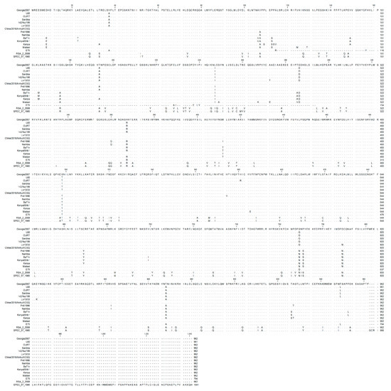Multiple sequence alignment of the indicated ASFV isolates of viral protein C962R. Matching residues are represented as dots.