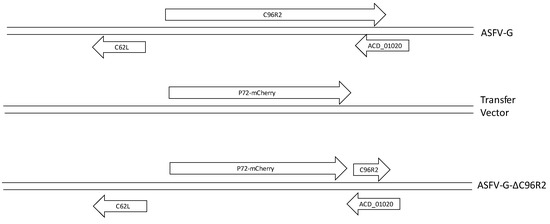 Schematic for the development of ASFV-G-ΔC962R. The transfer vector contains the p72 promoter and a mCherry cassette; the flanking left and right arms are indicated and were designed to have flanking ends to both sides of the deletion/insertion cassette. The resulting ASFV-G-ΔC962R virus with the cassette inserted is shown on the bottom.