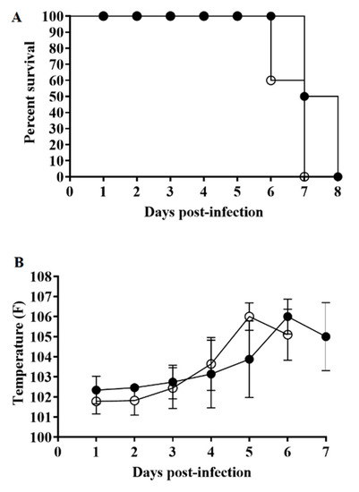 Evolution of mortality (A) and body temperature (B) in animals (5 animals/group) Intramuscular (IM) infected with 102 HAD50 of either ASFV-G-ΔC962R (filled symbols) or parental ASFV-G (open symbols). No significant differences in rectal temperatures between both groups of pigs were found at any sample time tested using the Holm–Sidak method (α = 0.05) without assuming a consistent standard deviation. All calculations were conducted using the software GraphPad Prism version 8.