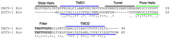 KcvATCV-1 sequence alignment with the sequence of the prototype chlorovirus K+ channel KcvPBCV-1 by ClustalW. The slide helix, outer transmembrane (TMD1) turret, pore helix, selectivity filter, and inner transmembrane (TMD2) of the KcvPBCV-1 are highlighted by the horizontal lines. Asterisks indicate positions which have a fully conserved residue. A colon indicates conservation between amino acids with strongly similar properties. A period indicates conservation between amino acids with less similar properties.