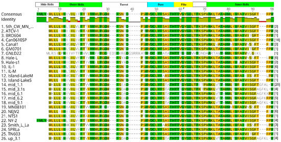 Alignment of the 26 unique proteins revealed that some areas of the Kcv protein were more conserved than others. The filter domain is typically the most highly conserved domain in K+ channel proteins and 20 of the 26 proteins had a TTVGYGDL sequence. Five of the remaining six Kcvs had a TTTGYGDL sequence and the remaining Kcv, KcvGLND22 from Greenland, had a TTTGFGDV sequence (Figure 2). All the SAG chlorovirus Kcvs essentially lack an N-terminal slide helix domain (Figure 1).