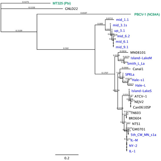 Phylogenetic tree of Kcv proteins from 26 SAG chloroviruses. PhyML, which is Maximum likelihood, with the default settings was used to construct the tree. The branch length shows dissimilarity between strains and the values on the branches are the number of changes. The viruses in blue represent the new Kcv proteins reported in this manuscript. Viruses MT325 representing a Pbi virus and PBCV-1 representing an NC64A virus are in green. Additional information on each of the Kcv proteins from the SAG viruses, including where they were isolated and the number of times that protein sequence appeared, is included in Table A1.