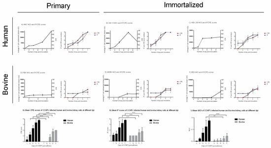MOI, CPE, and IF staining scores of CCHFV infected human and bovine kidney cells in CCHFV infected cells on days one, two, three, five, and seven dpi. The CPE scoring system was based on assigning numbers (from zero to four) to various levels of CPE where zero indicates no visible change, one indicates CPE up to one-quarter (1%–25%), two up to half (26%–50%), three up to three-quarters, (51%–75%) and four up to all (76%–100%) cells of the monolayers. Uninoculated cells were used as negative controls. The mean percentage of positive cells with green fluorescence emission in 24-well plates measured in triplicates were used to calculate immunofluorescence scores. The grading was based on a one to four scoring system: one indicates up to one-quarter (1%–25%), two indicates up to half (26%–50%), three up to three-quarter (51%–75%) and four up to almost all (76%–100%) cells emitting fluorescence. Uninoculated cells were used as the negative control. The total cell number was counted by Cellcounter. MOI was counted by the following formula: average fluorescent cell/area × 20 area/well × dilution divided by cell number/well (Equation (1)). Mean and SD were measured from triplicate measurements. MOI and CPE-IF scores display major differences between human and bovine cells with higher scores and levels in human cells in all indicated factors. (A) HMC MOI, CPE, and IF scores; (B) SW-13 MOI, CPE, and IF scores; (C) HEK-293 MOI, CPE, and IF scores; (D) PBK MOI, CPE, and IF scores; (E) MDBK MOI, CPE, and IF scores; (F) BEK MOI, CPE, and IF scores. Differences in the mean of three human and the mean of three bovine kidney cells MOI, CPE, and IF scores. (G) Mean human and bovine kidney cells CPE scores; (H) mean human and bovine kidney cells IF scores; (I) mean human and bovine kidney cells MOI scores. The mean and SD were based on triplicate measurements. ** p-value ≤ 0.01, **** p-value ≤ 0.0001.