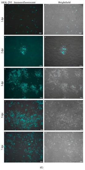 To quantify the amount of the intracellular viral genomic RNA (gRNA) harvested at different time points of incubation, RT-qPCR was conducted by QuantiNova®Pathogen+IC Kit (QIAGEN, Germantown, MD, USA). Briefly, the master mix of 15 μL contained 5 μL of 4× Reaction Mix, 6.3 μL of RNase-free water, 1.6 μL of each of forward and reverse primers (0.8 μM final concentration), and 0.5 μL of probe (0.25 μM final concentration). Five microliters of template RNA (500 ng) was added to complete the master mix to 20 μl. The cycling conditions were as follows: cDNA synthesis at 50 °C for 10 min, initial denaturation at 95 °C for 2 min, and 40 cycles of denaturation at 95 °C for 5 s, and annealing/extension at 60 °C for 30 s. The primers and probe were targeting the nucleoprotein gene (small segment) as previously described []: qPCR-F (5′-GGACATAGGTTTCCGTGTCA-3′), qPCR-R (5′-TCCTTCTAATCATGTCTGACAGC-3′) and qPCR-probe (5′-FAM-AGAACAACTTGCCAATTACCAACAGGC-BHQ1-3′). Standard linear plasmids were prepared by 10-fold dilutions equivalent to 2 × 103 to 2 × 108 copies/reaction mixture using pCD-N1 as the template []. The reactions were carried out in one step by a Rotor-Gene Q instrument (QIAGEN, Germantown, MD, USA) and all calculations were then transformed to log-based viral loads (copies/mL).