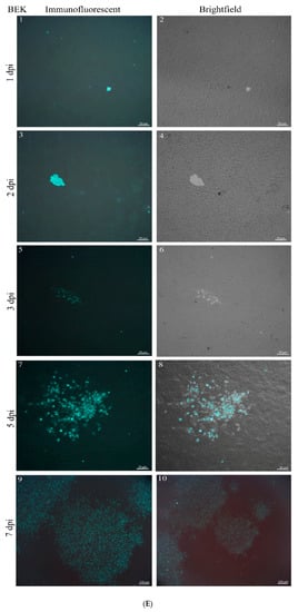 IIFA in primary and immortalized human and bovine kidney cells infected by CCHFV at days one, two, three, five, and seven dpi. Measurements were made in triplicates. Uninoculated cells were used as control. Merged brightfield and fluorescent images are indicated at the right side of the picture. Human kidney cells were infected with a broad distance from each other starting from three dpi, while infected bovine kidney cells remained restricted during the whole infection cycle and bigger islet-like formations were on view from five dpi. Magnification 20x (Scale bar: 50 µm). (A) (1,2) HMC at one dpi; (3,4) HMC at two dpi; (5,6) HMC at three dpi; (7,8) HMC at five dpi; (8,10) HMC at seven dpi. (B) (1,2) SW-13 at one dpi; (3,4) SW-13 at two dpi; (5,6) SW-13 at three dpi; (7,8) SW-13 at five dpi; (9,10) SW-13 at seven dpi. (C) (1,2) HEK-293 at one dpi; (3,4) HEK-293 at two dpi; (5,6) HEK-293 at three dpi; (7,8) HEK-293 at five dpi; (9,10) HEK-293 at seven dpi. For a better overview of the islet-like formations, three different magnifications were used: 5x (scale bar: 200 µm), 10x (scale bar: 100 µm), and 20x (scale bar: 50 µm) indicated in each picture. (D) (1,2) PBK at one dpi; (3,4) PBK at two dpi; (5,6) PBK at three dpi; (7,8) PBK at five dpi; (9,10) PBK at seven dpi. (E) (1,2) BEK at one dpi; (3,4) BEK at two dpi; (5,6) BEK at three dpi; (7,8) BEK at five dpi; (9,10) BEK at seven dpi. (F) (1,2) MDBK at one dpi; (3,4) MDBK at two dpi; (5,6) MDBK at three dpi; (7,8) MDBK at five dpi; (9,10) MDBK at seven dpi.