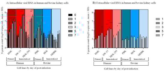Differential kidney cell line susceptibility to CCHFV, defined by intra- and extracellular gRNA copies at zero, one, two, three, five, and seven dpi. Measurements were taken in triplicate. The results represent both intra- and extracellular viral RNA. The mean viral loads on day one, two, three, five, and seven were compared to the mean viral load at day zero (1 h post-CCHFV inoculation). A significant increase in viral load was measured only in human cell lines. (A) Intracellular RNA in immortalized and primary cell lines; (B) extracellular RNA in immortalized and primary cell lines. All calculations based on log-transformed viral loads (copies/mL). * p-value ≤ 0.05, ** p-value ≤ 0.01, *** p-value ≤ 0.001, **** p-value ≤ 0.0001.