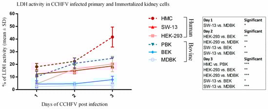 In the LDH assay, cells were infected with virus at 0.1 MOI and the cytotoxicity levels were measured in the following three days. Although, cytotoxicity increased over time in human and bovine kidney cells, higher values of LDH activity were detected in both immortalized and primary human cell lines as compared to bovine cell lines (Figure 5). In immortalized human cell lines (HEK-293, SW-13) at three dpi the cytotoxicity level reached an average 20.31% and 18.72% in HEK-293 and SW-13 respectively compared to immortalized bovine cells with 3.4% and 7.9% in MDBK and BEK cell respectively. The averageLDH level reached 41.62% in primary human HMC cells compared to 24.80% in the primary bovine PBK cells. Both human and bovine primary kidney cells showed a higher rate of cytotoxicity than the immortalized cells. Using Tukey’s multiple comparison test, we found a significant difference on one dpi between SW-13 and MDBK (p-value = 0.0224), on two dpi HEK-293 compared to BEK (p-value = 0.0061) and MDBK (p-value = 0.0019) and SW-13 compared to BEK (p-value = 0.0183) and MDBK (p-value = 0.0059). At three dpi significant differences were shown between HMC and PBK (p-value = 0.0001), HEK-293 compared to BEK (p-value = 0.0035) and MDBK (p-value = 0.0001) and SW-13 compared to BEK (p-value = 0.0122) and MDBK (p-value = 0.0004) (Figure 5).