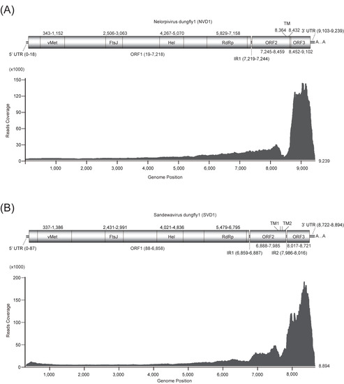 Genome organization and transcriptome raw read coverage of Nelorpivirus dungfly1 (A) and Sandewavirus dungfly1 (B). vMet, viral methyltransferase domain; FtsJ, RNA ribosomal methyltransferase domain; Hel, viral helicase domain; RdRp, RNA-dependent RNA polymerase domain; UTR, untranslated region; IR, intergenic region; TM, transmembrane domain; TM1 region, 7743–7811; TM2 region, 7872–7940.