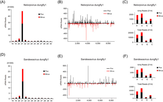 Profiles of virus-derived small interfering RNAs (vsiRNAs) of Nelorpivirus dungfly1 (NVD1) and Sandewavirus dungfly1 (SVD1). (A) Size distribution of NVD1 sRNAs. (B) Distribution of NVD1-derived sRNA along the corresponding viral genome. (C) 5′ terminal nucleotide preference of sRNAs 21 nt long derived from NVD1. (D) Size distribution of SVD1 sRNAs. (E) Distribution of SVD1 derived sRNA along the corresponding viral genome. (F) 5′ terminal nucleotide preference of sRNAs 21 nt long derived from SVD1. Color coding indicates viral sRNAs derived, respectively, from the sense (plus) and antisense (minus) genomic strands.