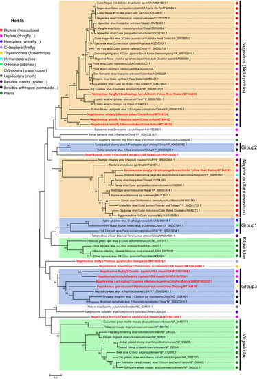 Negeviruses are also well-known for having a broad host range among biting Diptera, including nine genera of mosquitoes, that have been studied because of their importance to public health [3,5,15]. The viruses reported here and the subsequent in silico studies of public databases and published virome data show that the hosts of nege-like viruses are much more diverse. Known hosts now include insects belonging to the orders Diptera, Hemiptera, Coleoptera, Thysanoptera, Hymenoptera, Odonata, Orthoptera, and Lepidoptera and, interestingly, non-insect arthropods (spider, shrimp etc.) and even non-arthropod organisms (nematodes and anemone) (Table 2). These results provide strong evidence to support the previous hypothesis that the host range of negeviruses might have been greatly underestimated due to current sampling bias in favor of biting or blood-sucking arthropods [5,15]. It is clearly no longer tenable to regard negeviruses as insect-specific or mosquito-specific viruses.