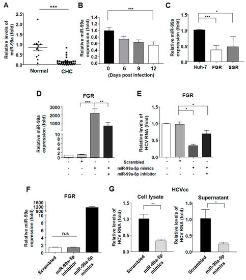 3.2. Overexpression of miR-99a-5p Attenuated HCV Replication