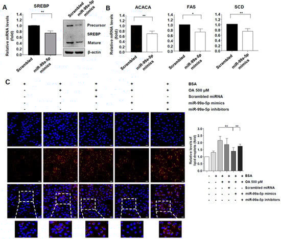 We further investigated whether miR-99a overexpression affected intracellular lipid accumulation. FGR cells were transfected with miR-99a-5p mimics or co-transfected with miR-99a-5p mimics and miR-99a-5p inhibitors. Treatment with oleic acids (OA) increased intracellular lipid levels in Huh-7 cells up to approximately 200% (Figure 3C). However, the level of accumulated intracellular lipid after treatment with OA decreased significantly in cells that overexpressed miR-99a-5p mimics compared with cells treated with scrambled miRNAs (Figure 3C). Moreover, the level of accumulated lipids increased in cells co-transfected with miR-99a-5p mimics and inhibitors compared with cells transfected only with miR-99a-5p mimics (Figure 3C). Collectively, these results indicated that miR-99a ameliorated intracellular lipid accumulation by regulating the expression of SREBP-1c and its target genes