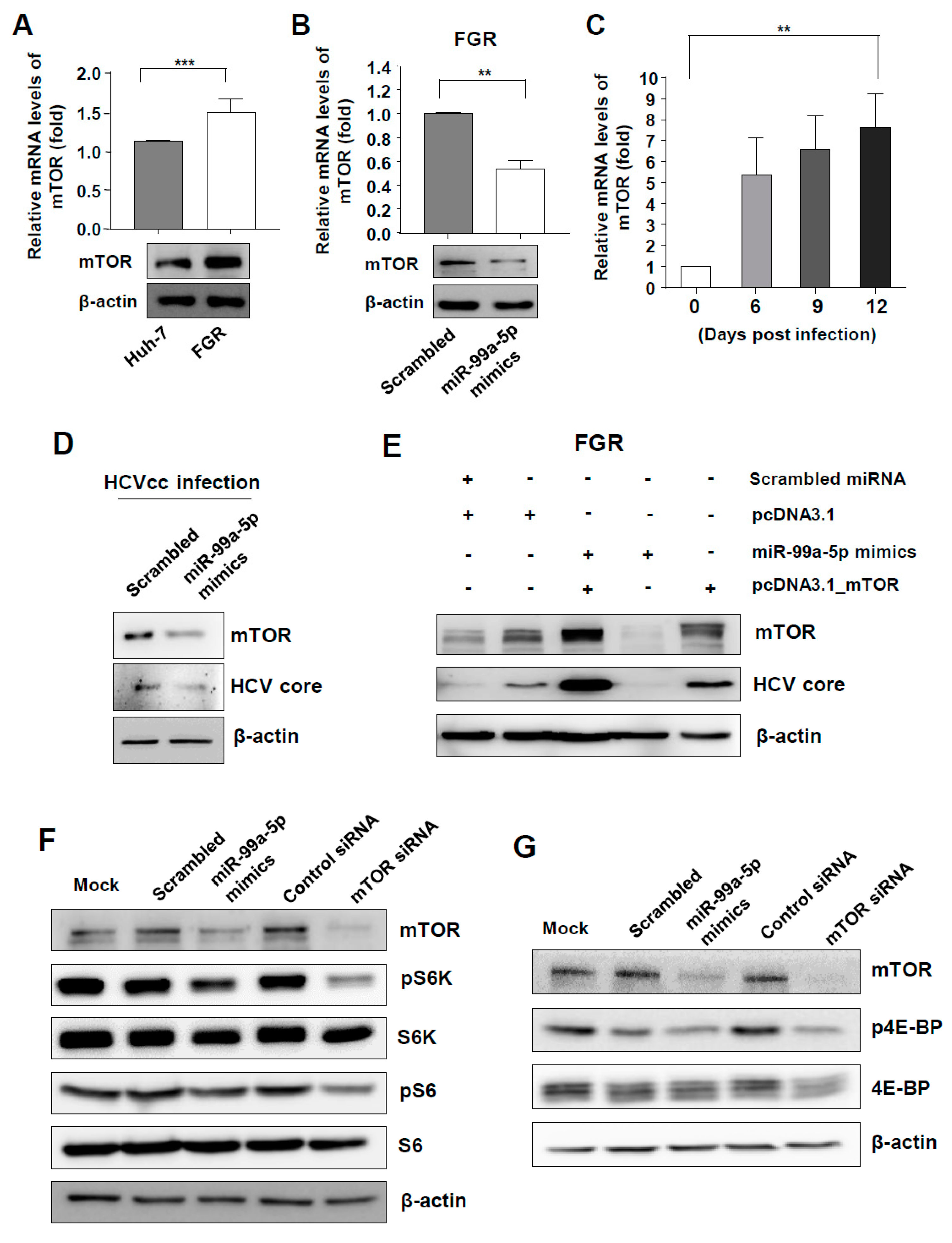 miR-99a causes inefficient HCV replication by regulating mammalian target of rapamycin (mTOR)/ sterol regulatory element binding protein (SREBP)-1c. (A) Expression levels of mTOR in parental Huh-7 and FGR cells. Means ± s.e.m. are shown (n = 3). Unpaired t-tests were performed. *** p < 0.001; (B) expression levels of mTOR in FGR cells 48 h after miR-99a-5p transfection. Means ± s.e.m. are shown (n = 3). Unpaired t-tests were performed. ** p < 0.01; (C) serial levels of mTOR expression after HCVcc infection in Huh-7 cells (MOI = 1). Repeated-measures ANOVA was performed. ** p < 0.01; (D) HCV core and mTOR protein levels 48 h after miR-99a-5p mimics transfection. Data from three independent experiments are presented; (E) HCV core and mTOR protein levels 48 h after miR-99a-5p mimics and/or pcDNA3.1_mTOR transfection. Data from three independent experiments are presented; (F) downstream signals (S6K) of mTORC1 after miR-99a-5p mimics or si-mTOR transfection in FGR cells. Data from three independent experiments are presented; (G) downstream signals (4E-BP) of mTORC1 after miR-99a-5p mimics or si-mTOR transfection in FGR cells. Data from three independent experiments are presented.