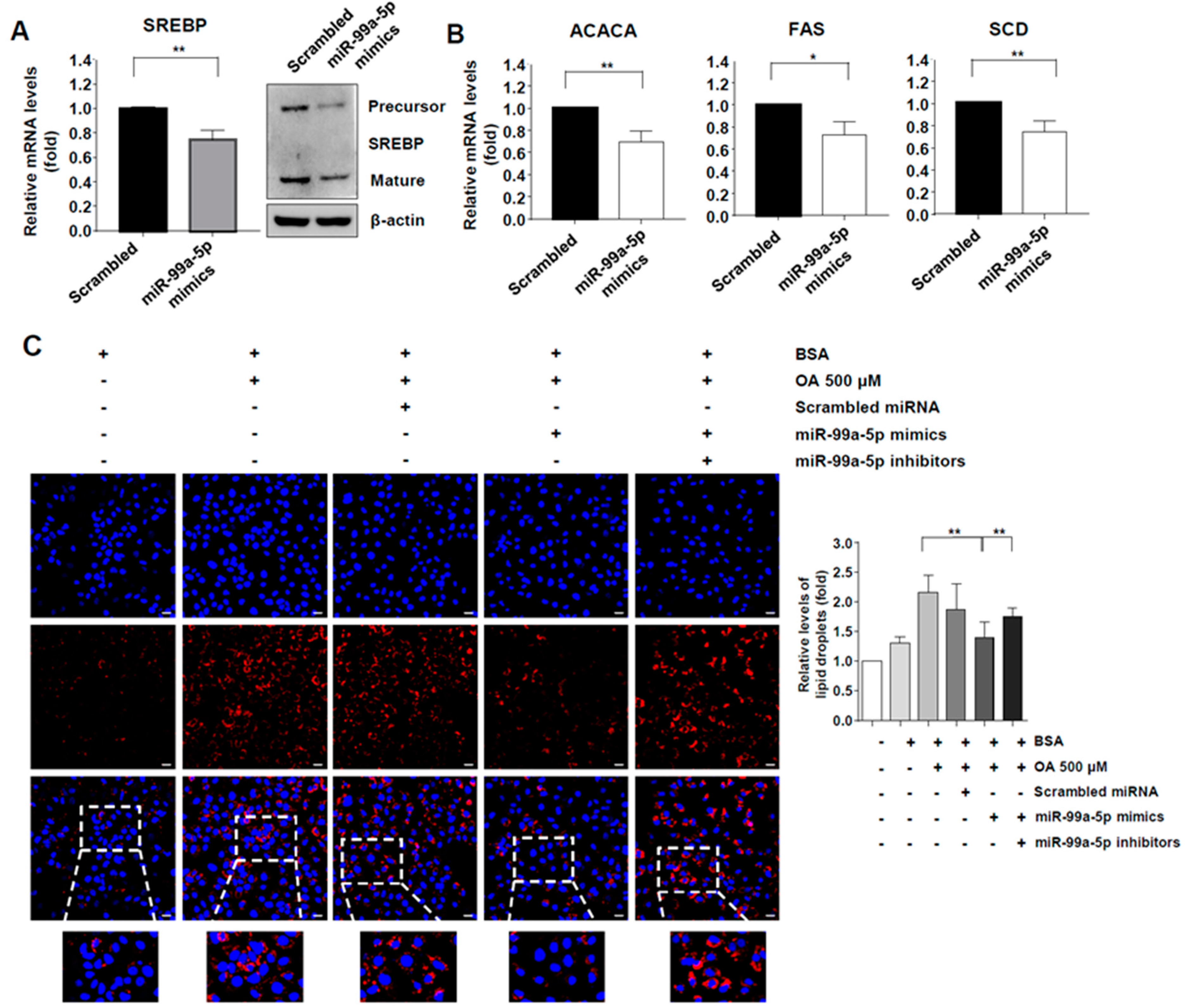 miR-99a ameliorates intracellular lipid accumulation by regulating mTOR/SREBP-1c. (A) Expression levels of SREBP1-c in FGR cells 48 h after miR-99a-5p transfection. Means ± s.e.m. are shown (n = 3). Unpaired t-tests were performed. ** p < 0.01; (B) expression levels of acetyl CoA carboxylase (ACACA), fatty acid synthase (FAS), and stearoyl CoA desaturase (SCD) in FGR cells 48 h after miR-99a-5p transfection. Means ± s.e.m. are shown (n = 3). Unpaired t-tests were performed. * p < 0.05. ** p < 0.01; (C) amount of intracellular lipid accumulation after OA (500 uM) treatment and miR-99a-5p mimics or inhibitors transfection. Data from two independent experiments are presented. Unpaired t-tests were performed. ** p < 0.01.