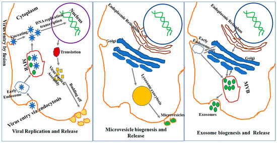 Virus replication and release share intracellular pathways with microvesicle and exosome biogenesis and release. Most of the cellular machinery involving the genome, endoplasmic reticulum, Golgi complex, lysosomes, late endosome, and multivesicular bodies (MVBs) are mutually used by viruses to replicate inside the cell and by the host cell for the generation of extracellular vesicles (EVs) such as microvesicles and exosomes.