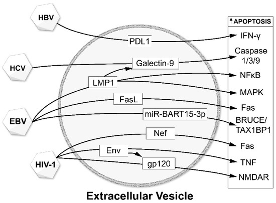 Pro-apoptotic effects of viruses on EV cargo. Several viruses including hepatitis B virus (HBV), hepatitis C virus (HCV), Epstein-Barr virus (EBV), and human immunodeficiency virus-1 (HIV-1) induce their pro-apoptotic effects through signaling molecules that are carried by EVs, which, in turn, act on a variety of apoptosis signaling pathways in the recipient cells.