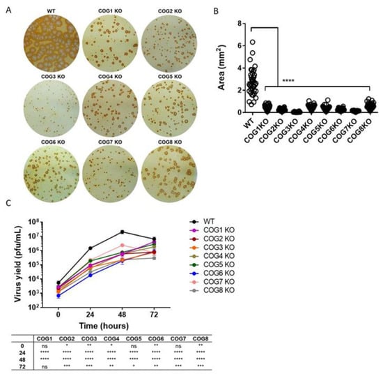 Decreased virus spread and yield in absence of conserved oligomeric Golgi COG genes. (A) Immunostaining of COG subunit knockout (KO) and wild type (WT) cells infected with West African monkey virus (MPXV WA) for 72 h. The infected cell monolayers were stained using an anti-vaccinia virus (VACV (c7D11 antibody, followed by an HRP-conjugated secondary antibody, and developed using o-dianisidine solution; (B) Area of individual foci in KO cell lines compared to WT. A total of 40 foci from each cell type were analyzed to determine area, and the average +/− standard error of the mean (SEM) are shown. Statistical difference between WT and KO cell lines indicated with asterisks; (C) Multi-step growth curve of MPXV WA in COG KO and WT cells. Virus yields determined at 0, 24, 48, and 72 hpi by plaque assay with 2–3 replicates per condition. Plotted values represent mean +/− SEM. Statistical difference between WT and KO cells for each time point tabulated below graph. For both (B) and (C), asterisks denoting specific p values. ns = not significant, * p ≤ 0.05, ** p ≤ 0.01, *** p ≤ 0.001, **** p < 0.0001.