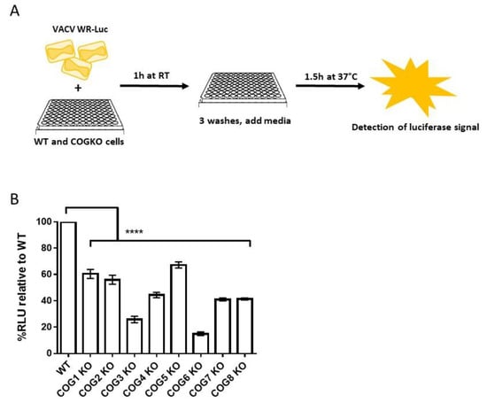 Lower virus entry in cells lacking COG genes. (A) Schematic representation of the luciferase-based viral entry assay; (B) Percent luciferase signal relative to WT in WT and COG KO cells infected with VACV-WR-LUC. Bars represent the mean of 3 replicates and error bars represent standard error. All groups compared to WT using a one-way ANOVA and Dunnett’s multiple comparison test: **** p < 0.0001.