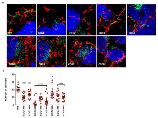 EV release from a host cell can occur through a variety of mechanisms including exocytosis, budding and actin tail formation. After actin tail polymerization takes place, cell-associated EVs can be loaded onto protrusions that extend to neighboring cells for cell-to-cell spread [13,29]. To determine if the defect in COG complex proteins affected EV release like GARP complex proteins, we infected WT and KO cells with VACV-A4-YFP and imaged cell-associated EV by confocal microscopy. As shown in Figure 3A, we observed actin tails (filaments in red) in all COG KO infected cells. However, there was a clear difference in the number of actin tails imaged per cell (Figure 3B). Actin tails were the most abundant in WT cells, present at significantly higher numbers than in the KO cells. Of note, we observed few to no actin tails in COG3 KO cells. Together, these data demonstrate that the lack of COG genes could impair EV release, and consequently viral spread, by partially inhibiting actin tail formation.