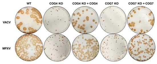 Here, we investigated the role of each of the COG complex subunits in OPXV infection using COG1–8 knockout cell lines. Our data demonstrated the requirement of COG complex proteins for the fusion and entry steps of vaccinia virus (VACV) infection. We also showed that the absence of COG proteins caused a decrease in the number of actin tails in infected cells, and decreased viral spread, as evidenced by smaller VACV and MPXV plaques produced in COG KO cells compared to wildtype (WT) cells. These data confirm the results of our haploid genetic screen and provide insights on the specific steps of the OPXV life cycle that are impacted by the presence or absence of COG complex genes.