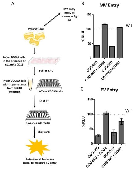 Viral entry can occur through both the MV and EV forms of OPXV particles. In order to evaluate entry of MV and EV separately, WT, KO and rescued cells were infected with VACV-LUC, harvested from infected cells (mainly MV) and from supernatant (mainly EV). To selectively quantitate entry of EV particles, BSC40 cells were infected in the presence of an anti-L1 antibody 7D11, an antibody known to potently neutralize MV particles by binding to the L1 protein expressed on the MV surface. The MV-depleted supernatants were then used to infect WT, COGKO and rescued cells to measure EV entry (Figure 5A). As shown in Figure 5B,C, both MV and EV entry were noticeably reduced in the KO cell lines compared to WT cells. Additionally, luciferase levels were restored to WT levels in the rescued cells demonstrating the specific involvement of COG4 and COG7 genes in the reduction of EV and MV entry (Figure 5B,C).