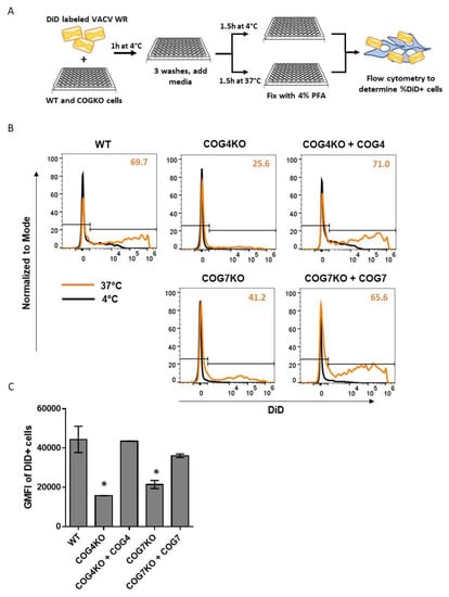 COG genes impact VACV fusion with host cell. (A) Schematic representation of membrane fusion assay using DiD-labeled VACV WR strain; (B) Histograms showing baseline fluorescence at 4 °C (black) and shift due to fusion at 37 °C (orange) for WT, KO, and rescued cell lines incubated with DiD labeled virus. Histograms normalized to mode (y-axis). X-axis denotes intensity of DiD fluorescence. The percentage of DiD-positive cells at 37 °C shown in the top right corner of each histogram plot in orange. Each treatment was tested in duplicate and one representative histogram overlay has been shown per condition; (C) Bar graph comparing the geometric mean fluorescence intensity (GMFI) of the DiD-positive population at 37 °C in each cell type. Values shown represent the average of two replicates +/− SEM. Statistical significance determined based upon one-way ANOVA and Dunnett’s multiple comparisons test. * p ≤ 0.05.