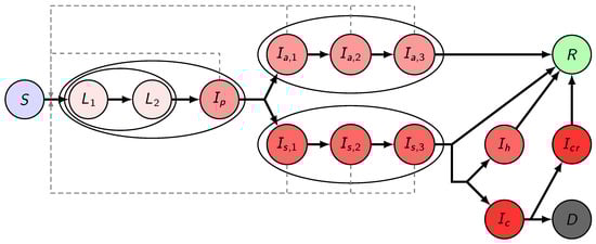 Here, we establish a compartmental population model, adjusted to the specific characteristics of COVID-19, considering the following compartments. We denote by S the susceptibles, i.e., those who can be infected by the disease. Latents (L) are those who have already contracted the disease but do not show symptoms and are not infectious yet. In accordance with studies indicating that viral shedding peaks before the onset of symptoms [44], in our model, we have introduced the presymptomatic infected compartment for those who do not have symptoms, but who already are capable of transmitting the disease to susceptibles. We divided the latent period into two compartments and , thus, together with , the incubation period follows a hypoexponential distribution, having a shape matching empirical observations [45,46]. Since a large fraction of infected shows only mild or no symptoms, after the incubation period, we differentiate these individuals from those with symptoms. We assume a gamma-distributed infectious period with Erlang parameter , similar to the SARS study [47], hence, we have three classes for both asymptomatic and symptomatic infectious individuals ( and , respectively). Individuals from the compartment will all recover and hence proceed to the recovered class . Immunity is assumed for those who have recovered from the disease, at least for the time scale of this modeling. Individuals from may either recover without requiring hospital treatment (and thus move to ) or become hospitalized. It is of crucial importance to project the number of hospital beds and intensive care unit (ICU) beds needed; thus, in the model, we further differentiate symptomatically infected individuals who need hospital care and critical care, denoted by and , respectively. We operate with the assumption that the healthcare system will not be overwhelmed, and thus disease-induced death is only considered from critical care that fits with the data obtained from NPHC. Hence, individuals from will proceed to after recovery. Those from with fatal outcome transit to the compartment. Those who are out of ICU and on the path to recovery are collected into the , from where they eventually recover and move to the class.