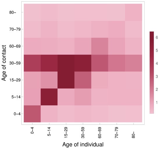 For creating our contact matrix , we have utilized the work by Prem, Cook, and Jit [56], where the estimated matrices are written for 16 age groups, namely 0–4, 5–9, …, 70–74, 75+. As we have divided the Hungarian population into seven age groups, see Table 2, we aggregated the higher resolution data. First, we derived a symmetric matrix with elements