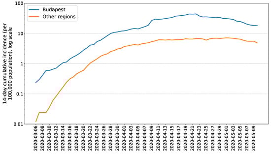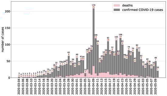 The first Hungarian COVID-19 cases were reported during the first week of March 2020 through the Hungarian Notifiable Disease Surveillance System operated by NPHC which is the source of data described in this section (for the most recent information, see [10]). The first case, an Iranian 27-year old man (studying and residing in Hungary) who recently returned from Tehran, was reported on 4 March 2020. By 10 May 2020, the cumulative number of reported confirmed COVID-19 cases were 3284 (33.1 cases per 100,000 population), including 421 deaths (crude CFR 12.8%), see Figure 3 for the daily reported numbers.